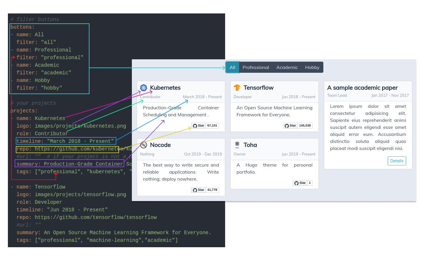 The purpose of the Projects section is to effectively showcase your projects. In this post, we will guide you on how to configure the Projects section on your site. For a complete reference, please refer to the sample projects.yaml file.