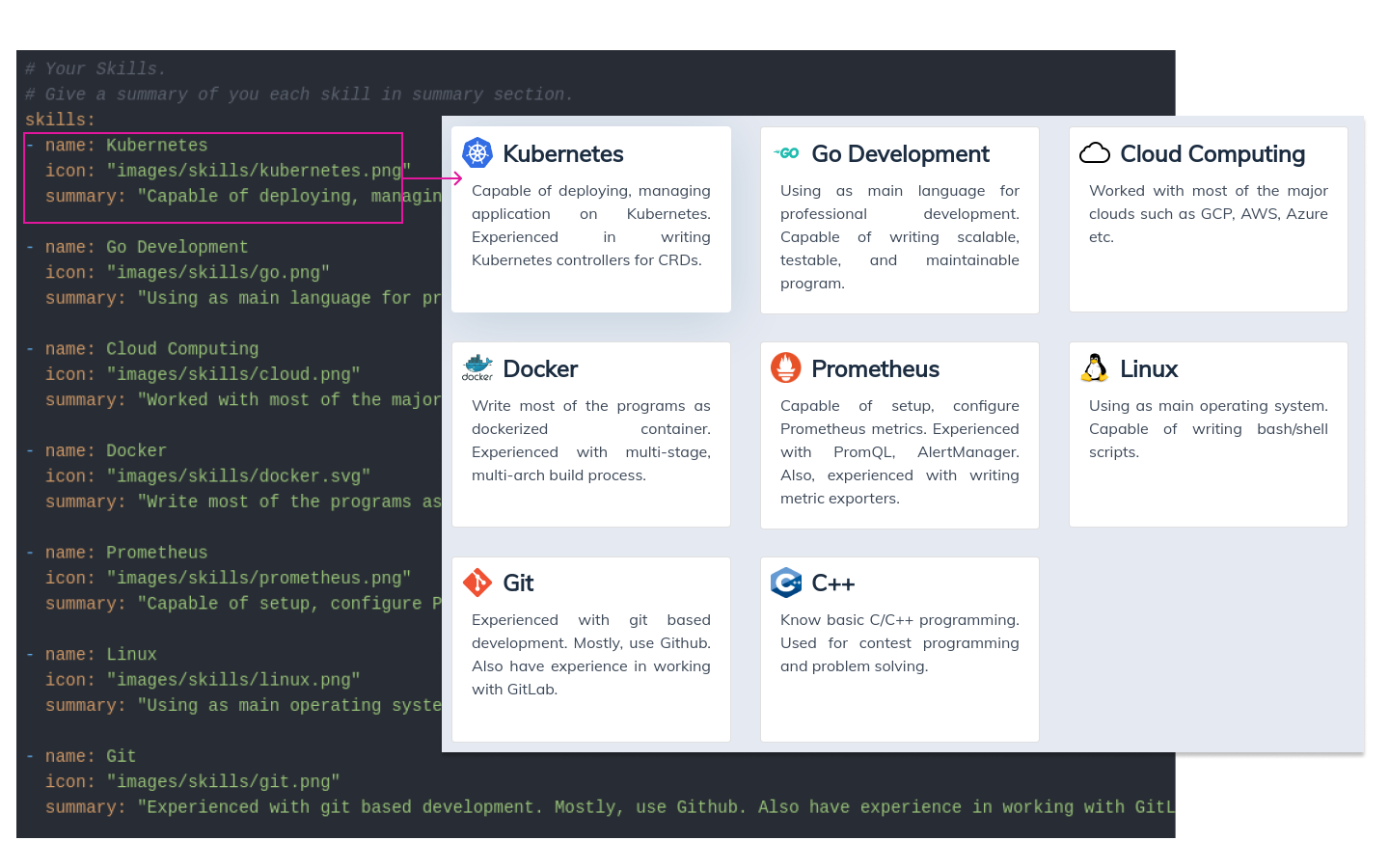 The Skills section is designed to showcase your skills and provide insights into your expertise in each skill. In this post, we will guide you on how to configure the Skills section of your site. For a complete reference, please check out the sample skills.yaml file.