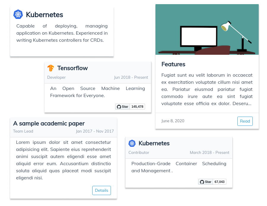 The skill and project cards are designed carefully to give more meaningful information. The skill cards not only just list your skills. It also gives the viewer an idea about your depth of knowledge of the particular skill. The project cards give an idea about the popularity of your project if it is an open-source project on Github.
